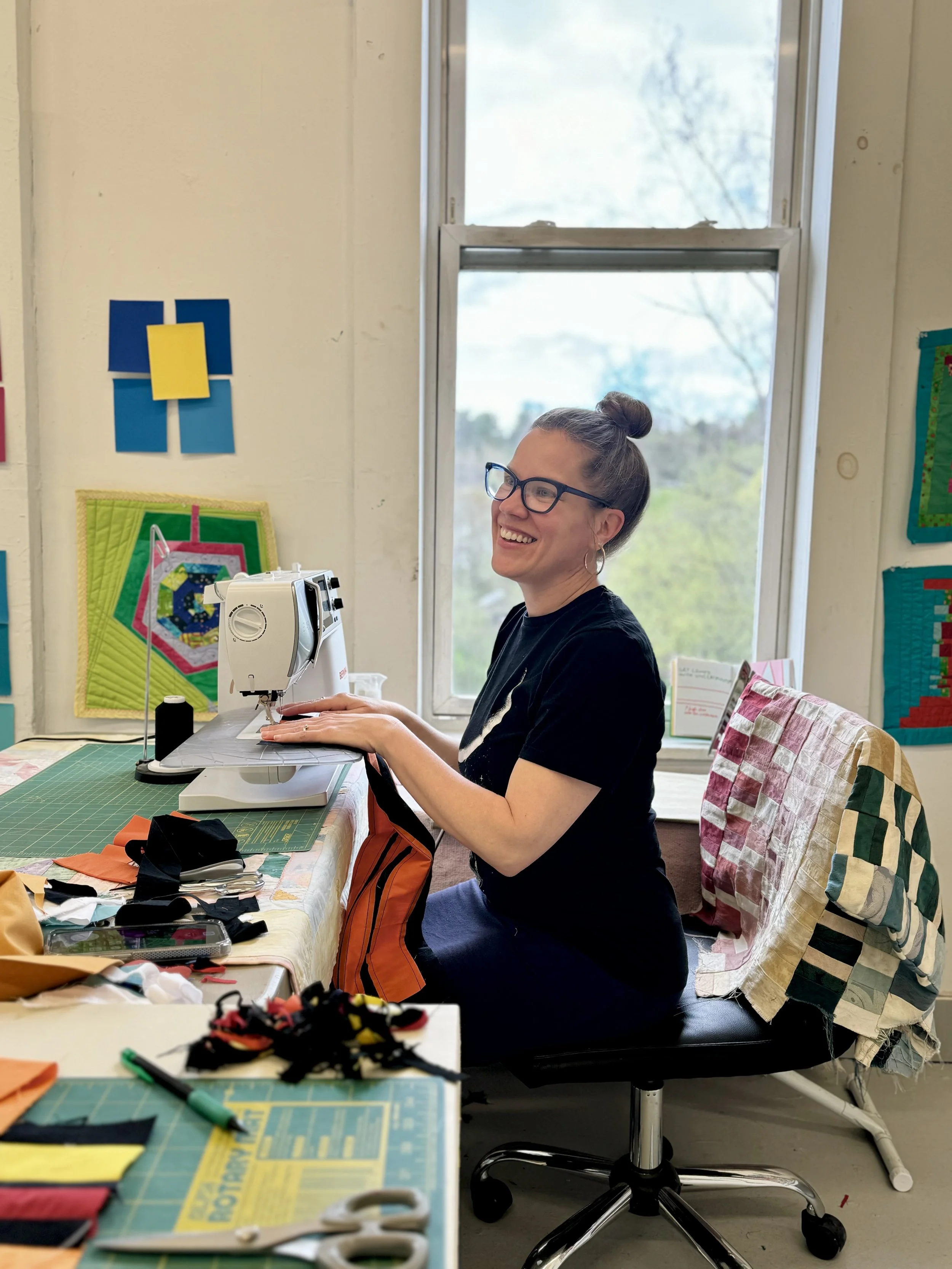 I use the process of piecing and quilting to explore containment, disruption and repair. I construct compositions where structure and improvisation coexist. Line interrupts shape, centers press against their frame and forms are forced to adapt rather than conform. The traditional association of quilting with care and protection becomes a place to examine the ways their presence or absence define experiences. Color establishes tension and pulse while visible stitching records time and decision making. My work holds moments of interruption and disruption without erasure, marking space that is both supported and unsettled. Space where adaptation is visible and transformation is embraced.